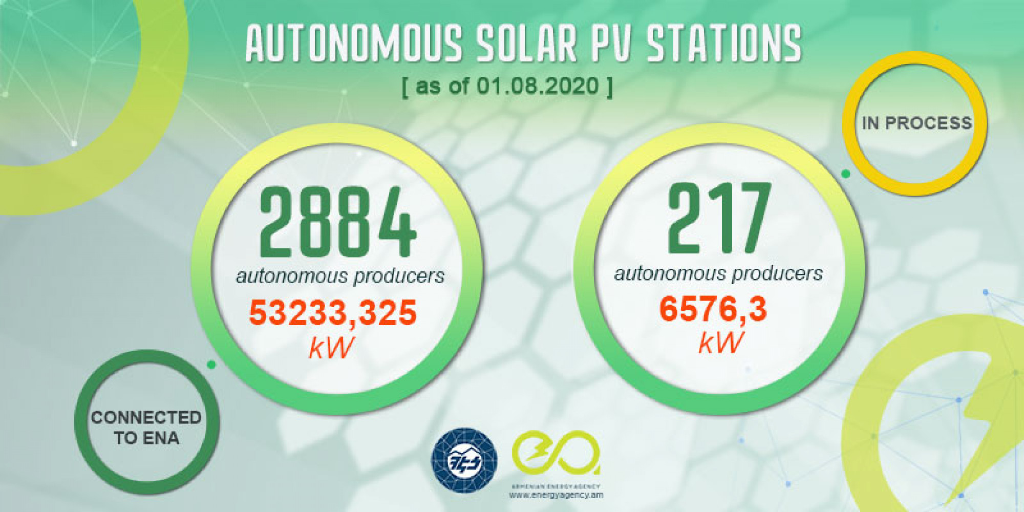 2020թ. Օգոստոսի 1-ի դրությամբ ՀԷՑ-ին միացված են 2884 ինքնավար արտադրող արևային կայաններ 53233,325 կՎտ հզորությամբ և ընթացքում են 217-ը՝ 6576,3 կՎտ ընդհանուր հզորությամբ: