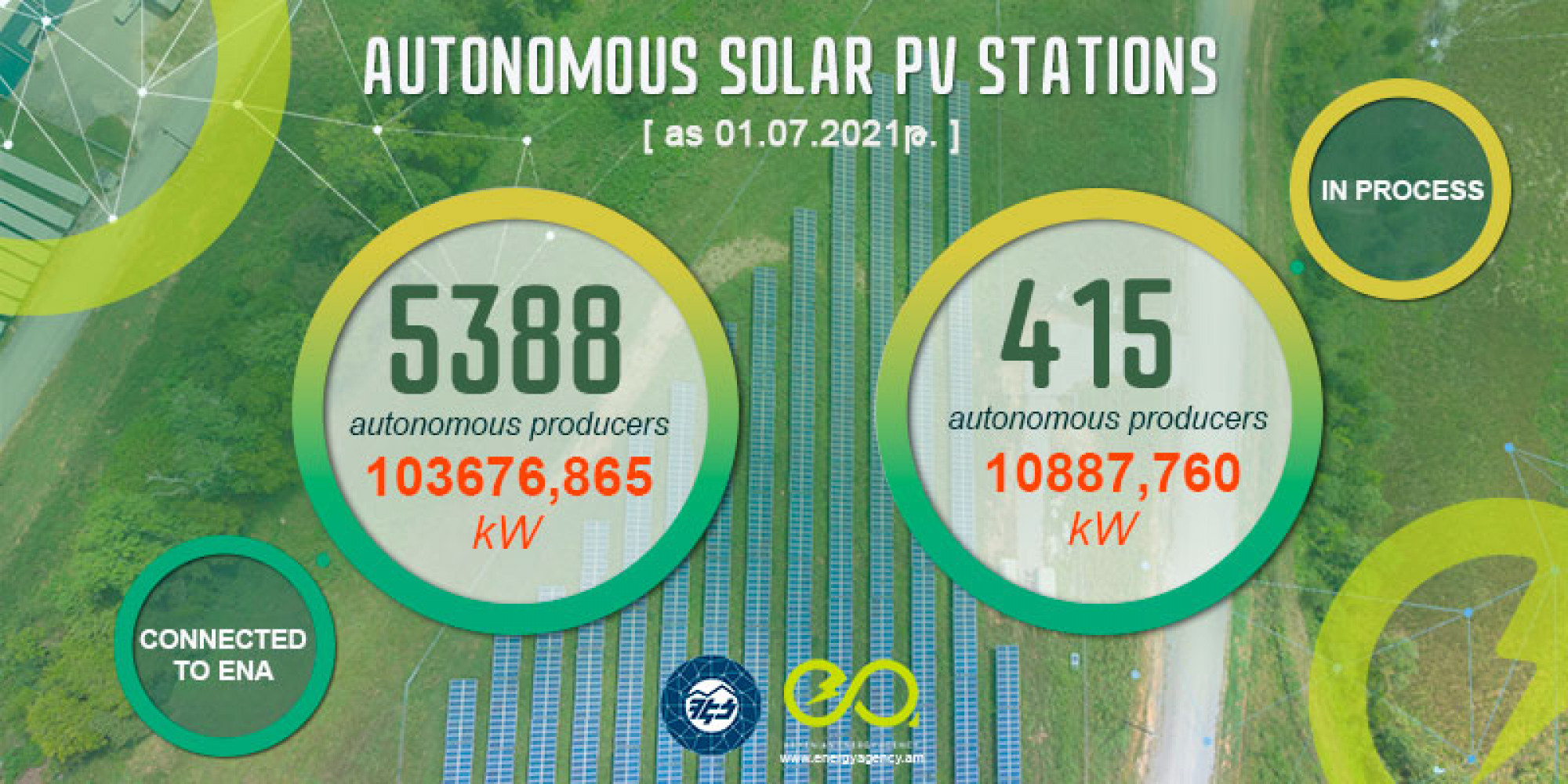 As of 01 July 2021, 5388 autonomous solar energy producers are connected to the "Electric Networks of Armenia" with a 100751.155 kW total capacity. An additional 415 with 10887,760 kW total capacity is in the process of connection.