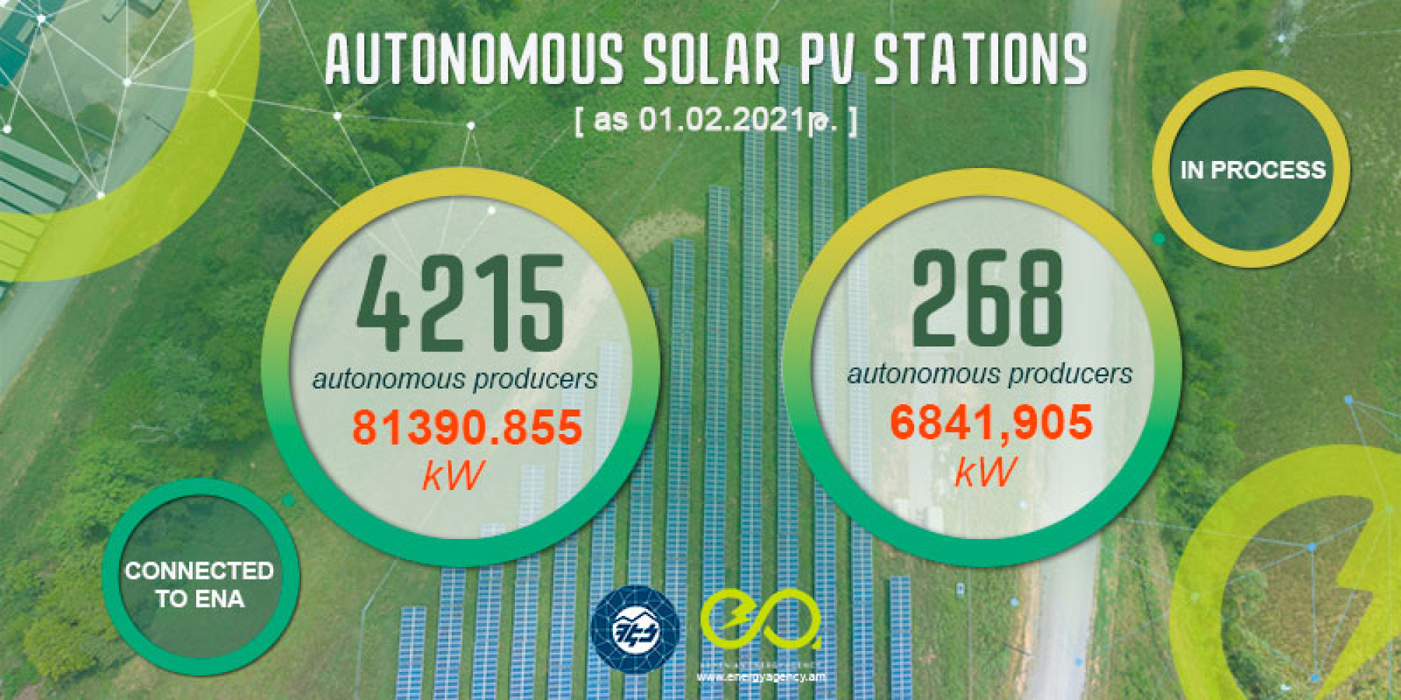 As of 01 February 2021, 4215 autonomous solar energy producers are connected to the "Electric Networks of Armenia" with an 81390.855 kW total capacity. An additional 268 with 6841,905 kW total capacity is in the process of connection.