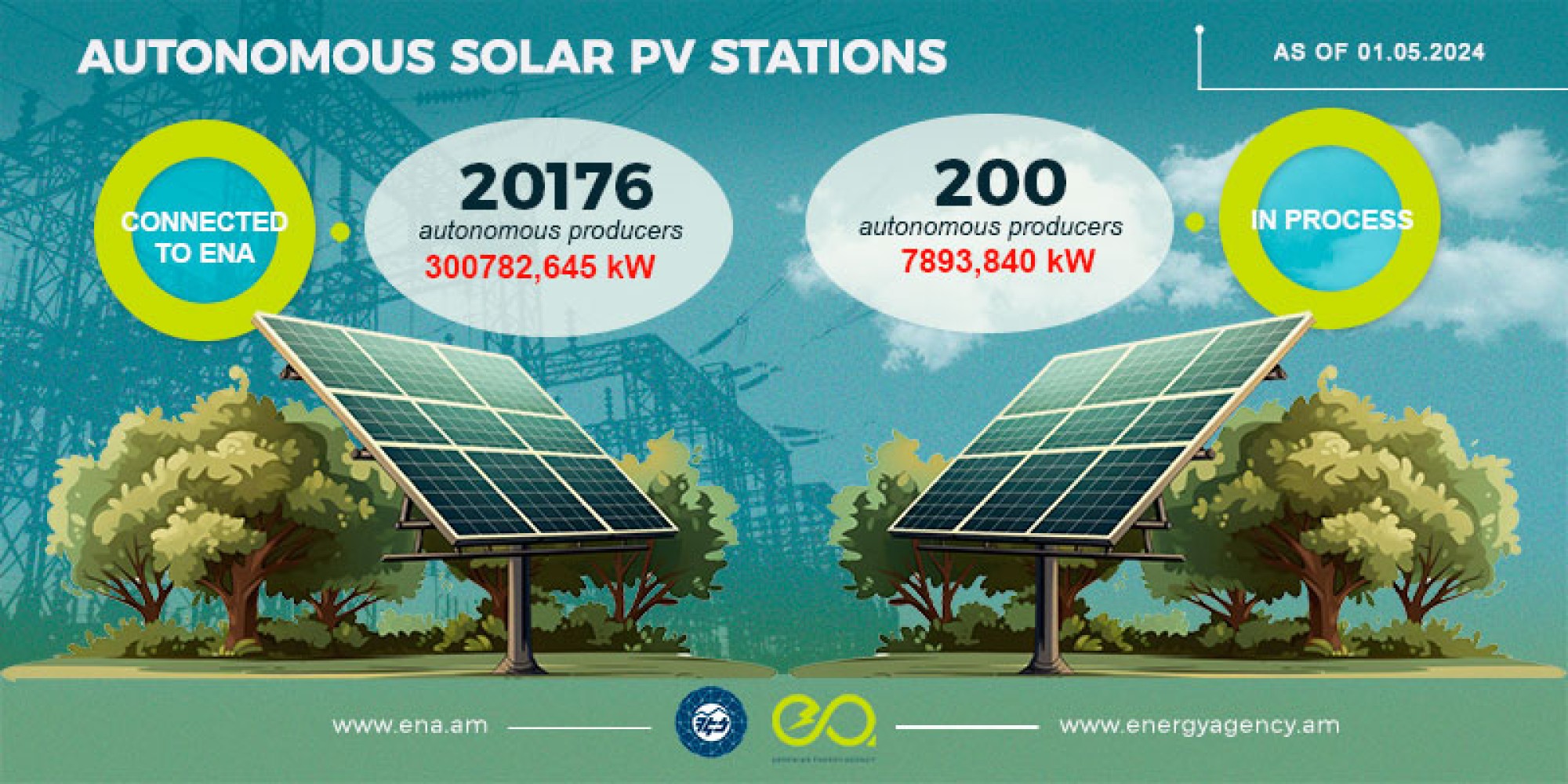 As of 01 May 2024, 20176 autonomous solar energy producers are connected to the "Electric Networks of Armenia" with a 300782,645 kW total capacity. An additional 200 with a 7893,840 kW total capacity is in the connection process.